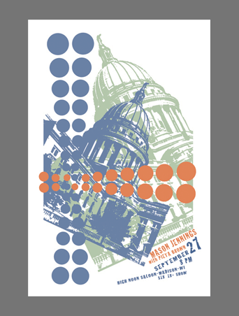 Promotional poster for a gig at the High Noon Saloon. Less about the music, than the view when you drive toward the venue from the east. The street is on a direct axis with the capitol building.